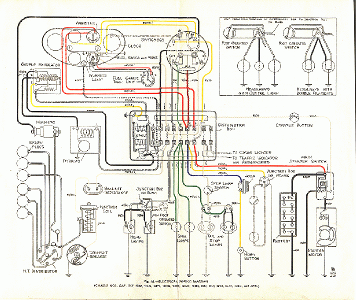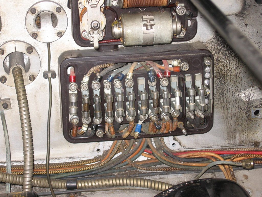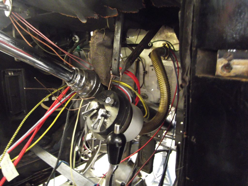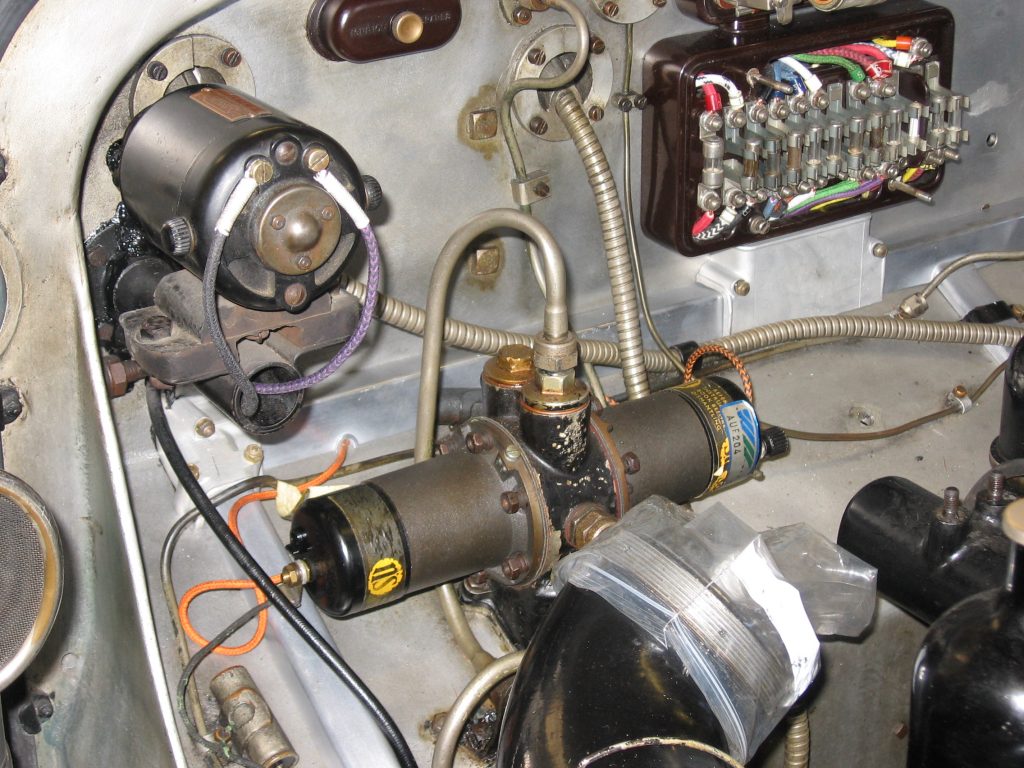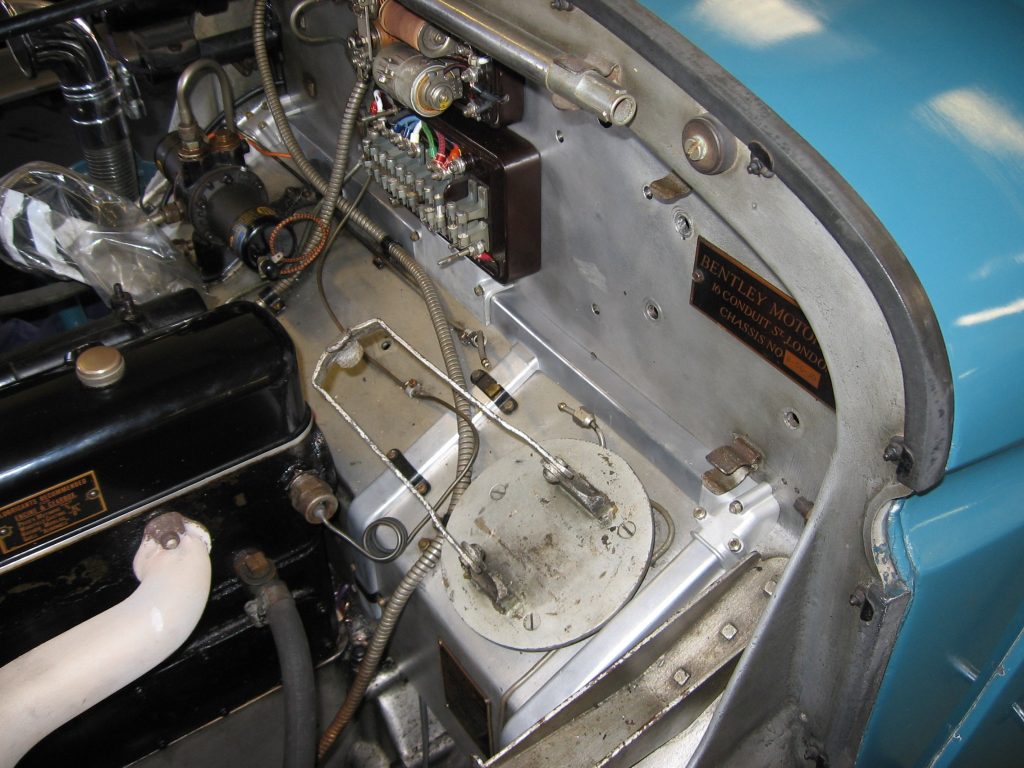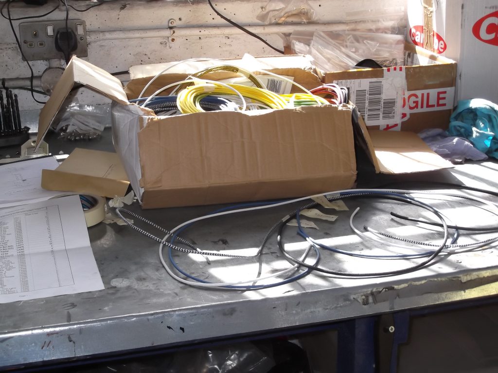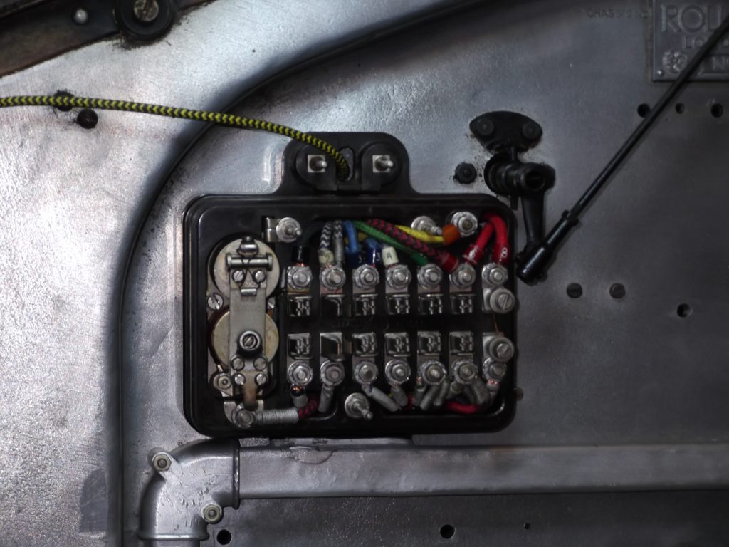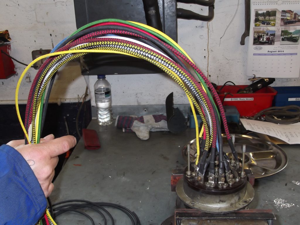 As part of a major restoration we carried out a rewire, whipping the cable ends as they would have been at the time. You can see the wiring “kit”, which is lengths of different coloured, cotton braided cables, together with a typical wiring diagram. We were asked to add indicators to this car (for the sake of safety), as well as a USB charging point (which was hidden out of sight).